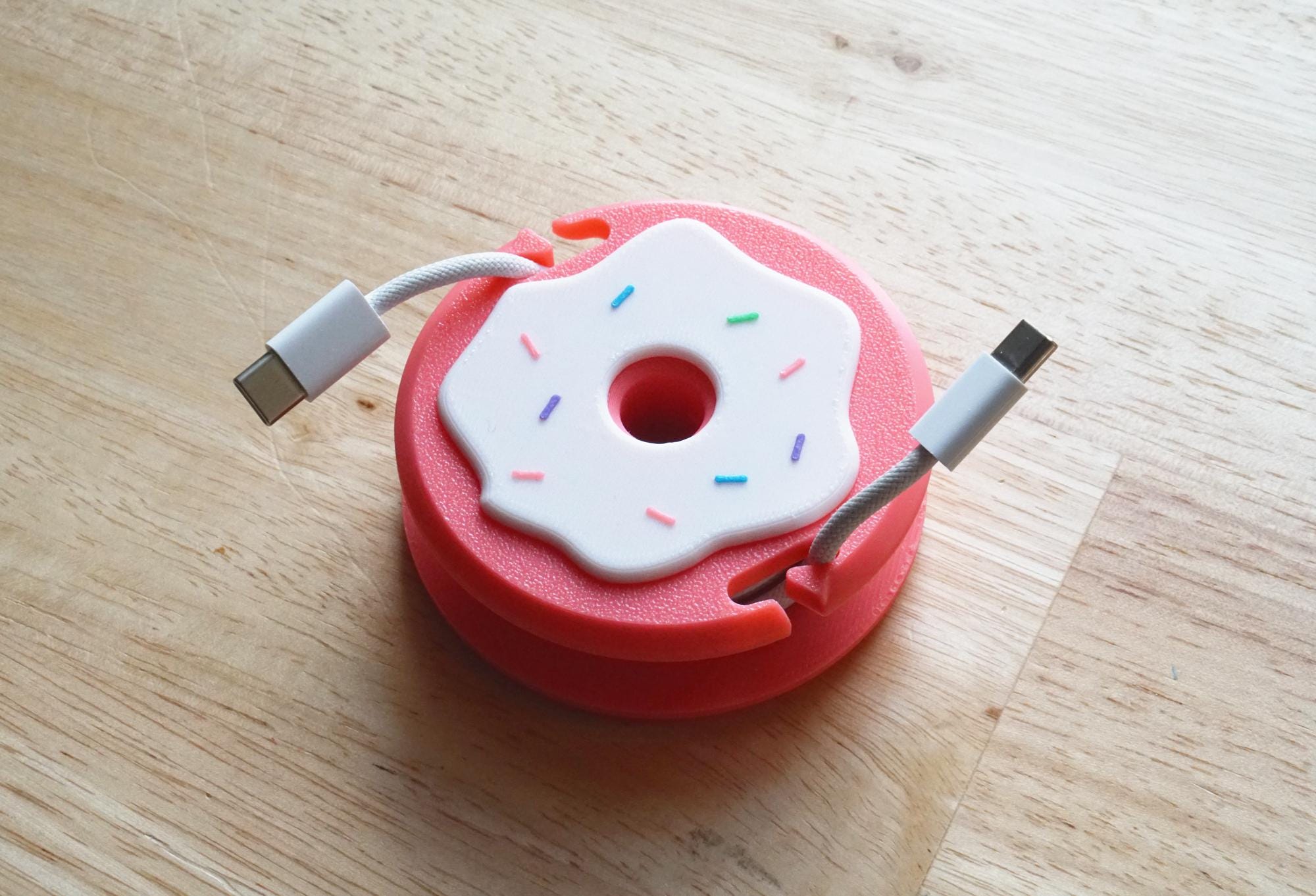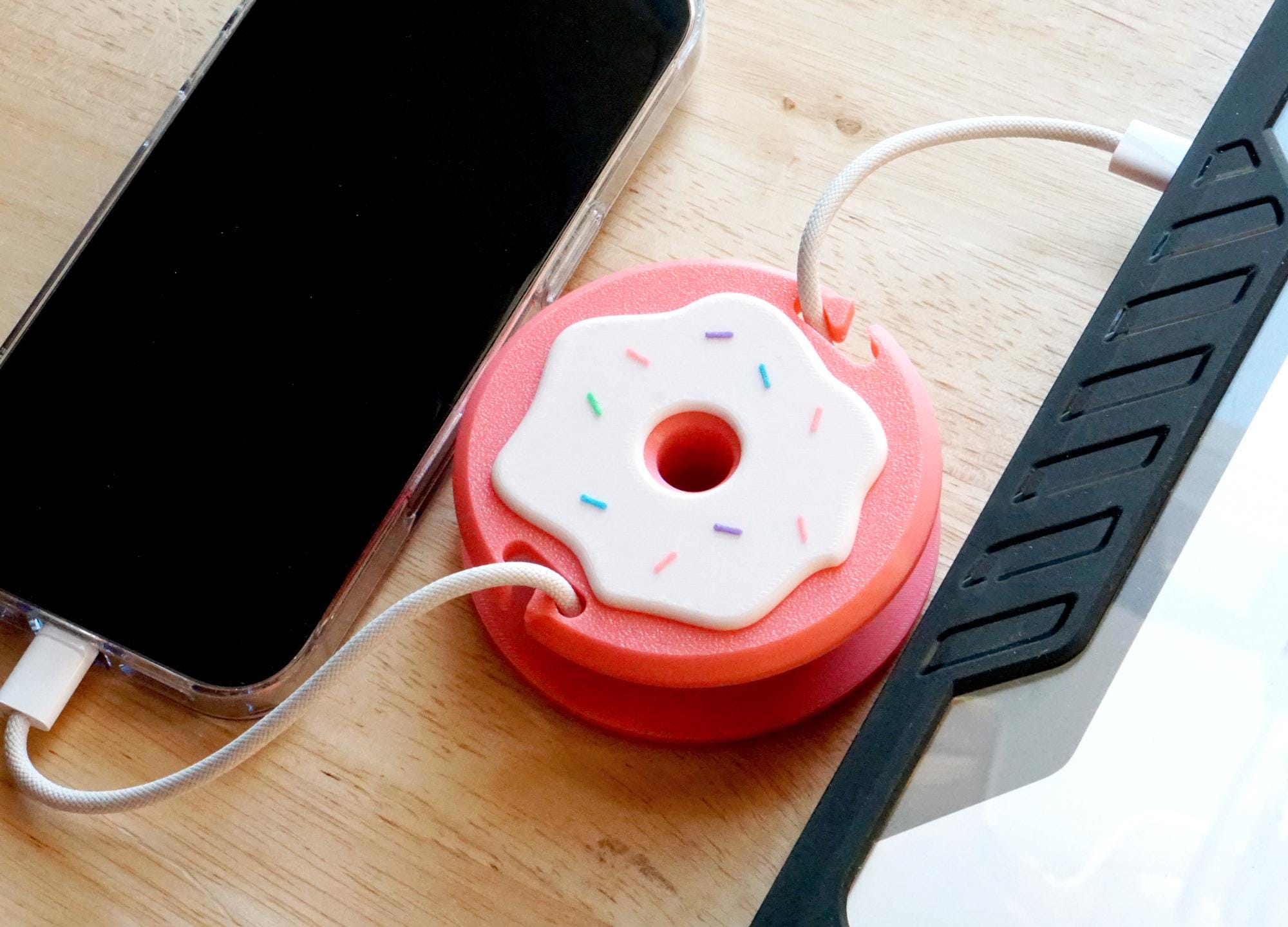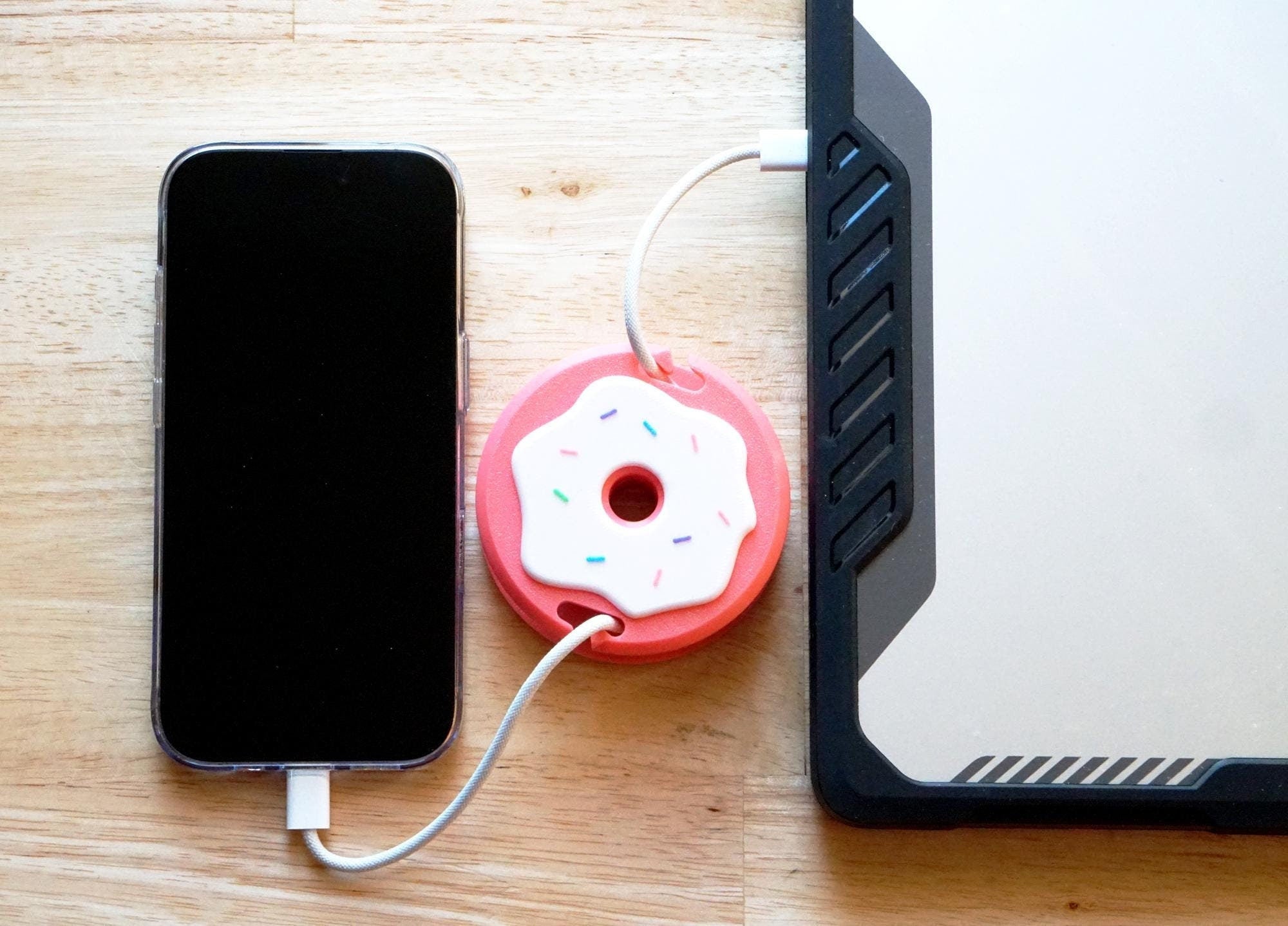 Add a touch of fun and functionality to your cable organization with the Frosted Pink Donut with Sprinkles Cable Winder and Organizer. Designed to keep your cords neat and tangle-free, this compact and portable winder is perfect for travel, work, or home use. Its adorable frosted donut shape adds a playful charm while serving as a practical tool to organize your phone and Apple watch charging cables.